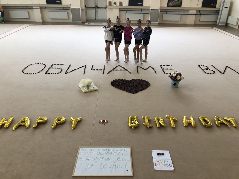 Гимнастичките от националния отбор за девойки (индивидуално) направиха страхотна изненада на своята треньорка Райна Тошева по случай рождения й ден. Момичетата засвидетелстваха любовта си, като украсиха килима на залата с надпис “Обичаме ви” и огромно сърце.