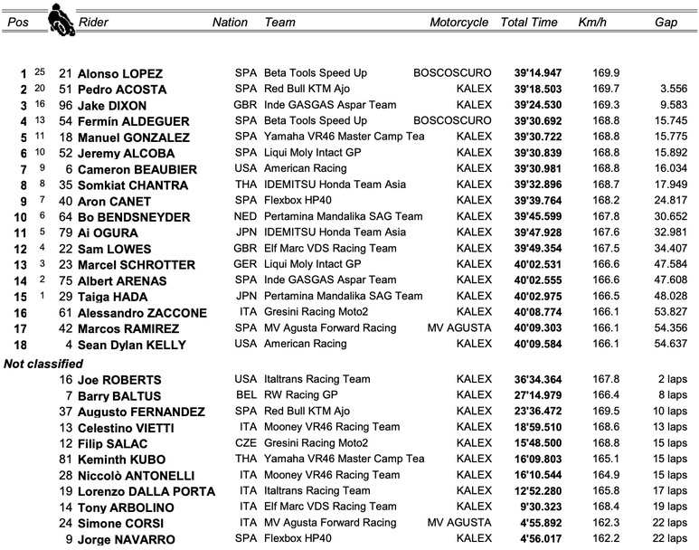 Второто място в Австралия си заслужи миналогодишният шампион в Moto3 Педро Акоста, а топ 3 допълни пилотът на Аспар Джейк Диксън, за когото това е пето качване на подиума през 2022 година. И в петте случая британецът бе на най-ниското стъпало на почетната стълбичка. За Акоста пък това е четвърти подиум този сезон, а на финала той завърши на цели 3.5 секунди зад Лопес.