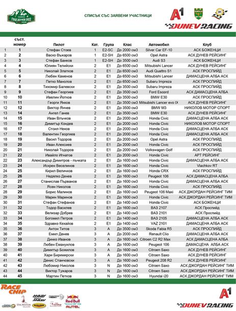 Сред списъка е и победителят от „Шипка-Дамасцена“ и „Мемориал Валерий Великов“ Стефан Стоев (Silver Car EF-10). Неговия пряк конкурент за победата в предпоследния кръг от шампионата Юлиян Телийски (Mitsubishi Lancer) също възнамерява да вземе участие, като по всичко личи, че той е успял да възстанови своя автомобил след тежка повреда.