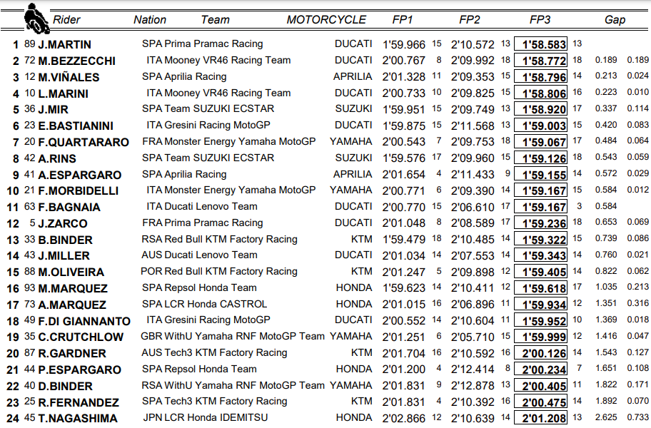 Така Баная ще трябва да се включи в първите 15 минути на сесията за място по-късно днес и ще трябва да бъде сред най-бързите двама в тях, за да се класира за решителната фаза. За нея директно освен Мартин и Морбидели се класираха още Марко Бедзеки, Маверик Винялес, Лука Марини, Жоан Мир, Енеа Бастианини, Фабио Куартараро, Алекс Ринс и Алейш Еспаргаро.