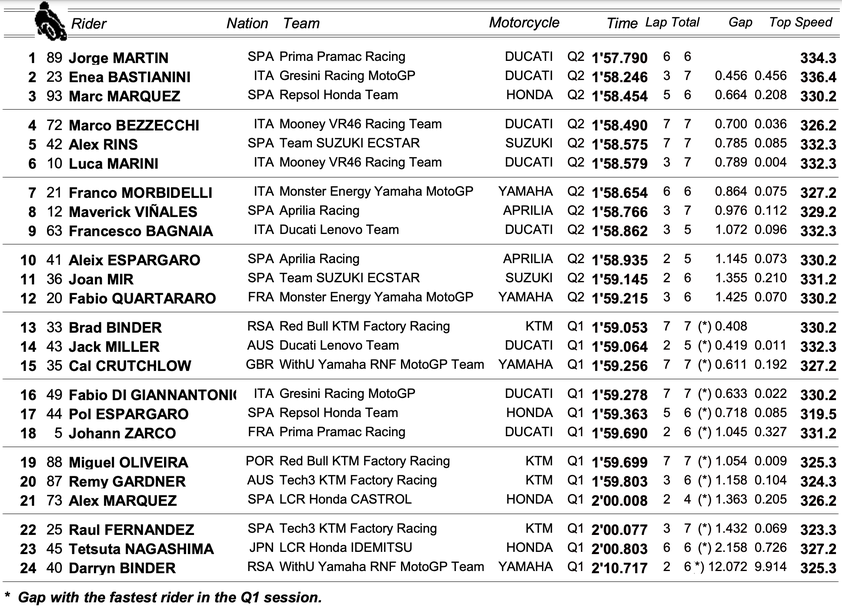 Испанецът успя да стигне до 1:57.790, с което подобри с цели 0.513 секунди досегашния рекорд на „Сепанг“, който бе поставен от Фабио Куартараро в квалификацията през 2019 година. Втори на стартовата решетка утре ще бъде Енеа Бастианини, който също след под постижението на световния шампион от преди три години, но бе с грандиозните за MotoGP 0.456 по-бавен от Мартин.