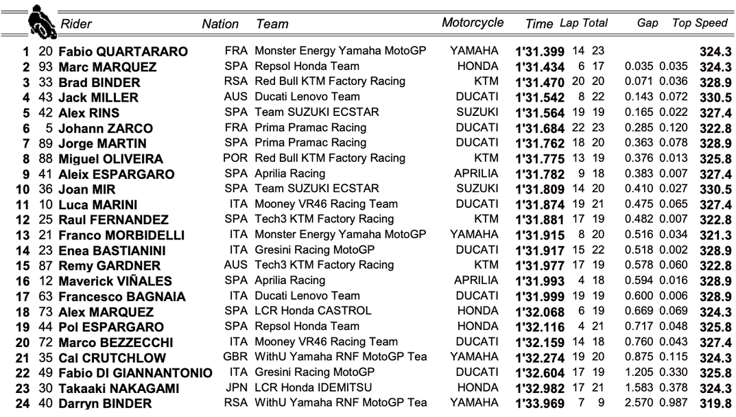 Тройката в края на първите 45 минути за подготовка допълни Брад Биндър от КТМ, който в самия край на сесията записа своето най-добро време с чисто нови гуми, като южноафриканецът завърши на 0.071 от Куартараро. Неговият бъдещ съотборник Джак Милър и Алекс Ринс от Сузуки завършиха четвърти и пети, като двамата изостанаха с 0.143 и 0.165 от лидера.