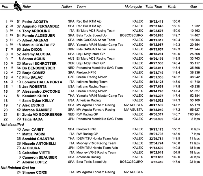 В крайното класиране в Moto2 Фернандес печели титлата с 271.5 точки и аванс от 29.5 спрямо Огура. Тройката затвори Арон Канет, който днес не стигна до финала след грешка на петия завой в 20-та обиколка. Преди падането си испанецът се движеше четвърти и настигаше Арболино. Канет завърши сезона с точно 200 точки в своя актив.