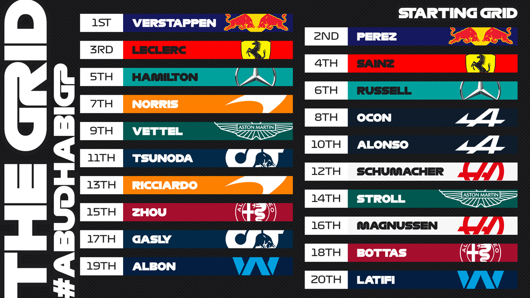 От полпозишъна финалното състезание за годината ще започне световният шампион Верстапен, който вчера стана първия пилот, който печели три поредни квалификации на пистата „Яс Марина“. Днес нидерландецът ще гони своята 15-та победа в 22 старта за годината, както и третия си пореден триумф в Гран При на Абу Даби.