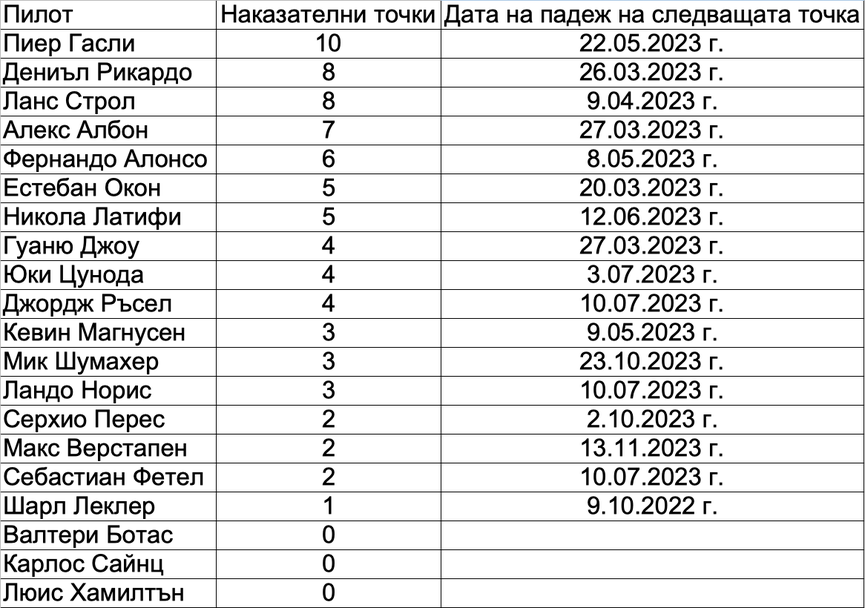 Гасли можеше да има и 11 точки, но по някаква причина не получи наказателна точка за превишаването на скоростта в бокса по време на Гран При на Сао Пауло. С втория най-голям наказателен актив са Ланс Строл и Дениъл Рикардо, които имат по 8. Австралиецът обаче няма да бъде титулярен пилот през следващия сезон, така че неговият актив ще се нулира преди евентуалното му завръщане на стартовата решетка през 2024 година.