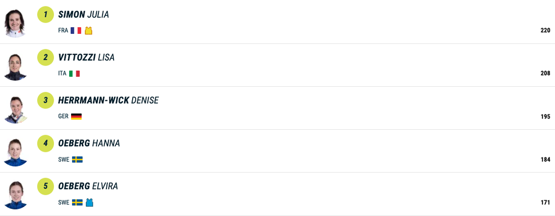 В генералното класиране в Световната купа по биатлон след 18-та си позиция днес Витоци загуби лидерската позиция за сметка на Симон, която с общ актив от 220 точки води с 12 на италианката. Тройката с пасив от 25 пункта затваря днешната победителка Херман-Вик. Германката е начело в битката за малкия кристален глобус в спринта, където със 130 точки тя води с 11 на Хаузер и 32 на Витоци.
