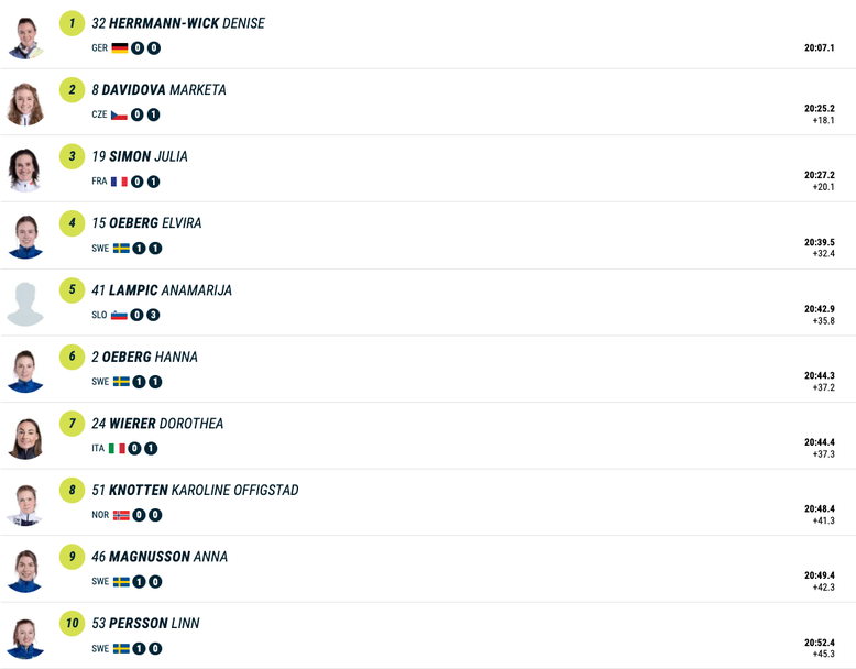 На 3.4 пред Лампич завърши по-малката от шведските сестри Йоберг – Елвира, която направи по една наказателна обиколка в двете си стрелби. Същото стори и нейната сестра Хана, която се класира на 6-то място, с пасив от 4.8 спрямо Елвира.
