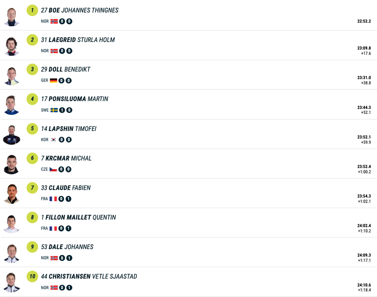 Тройката в третия спринт за сезона затвори бившият световен шампион в дисциплината Бенедикт Дол от Германия, който направи едно от малкото си състезания с безгрешна стрелба. Въпреки това представителят на бундестима остана на 38.8 секунди зад победителя.