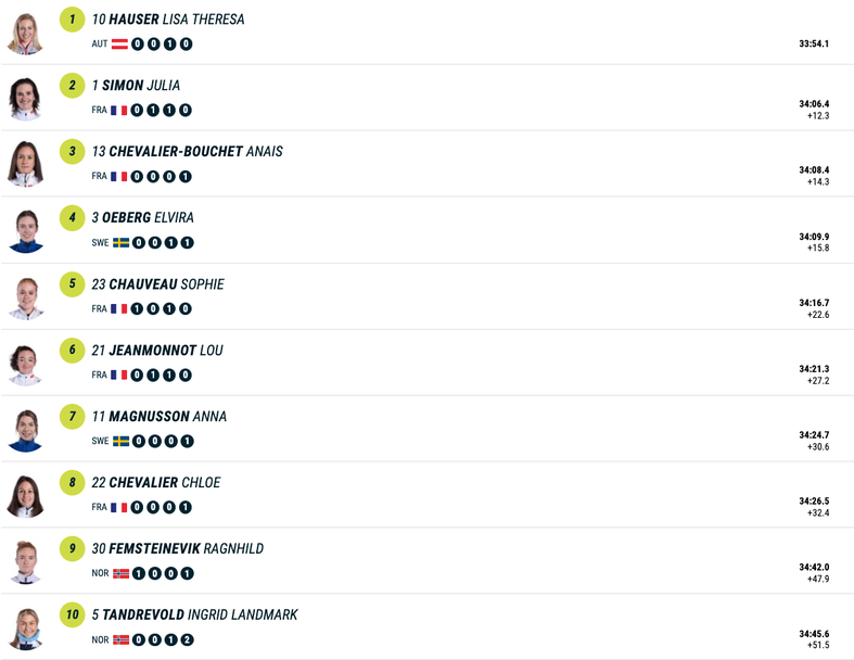 Победителката от вчерашното преследване Елвира Йоберг допусна по една грешка в двете си стрелби от положение прав и завърши четвърта, а петицата преди двуседмичната пауза в сезона затвори третата от французойките Софи Шово, за която уикенда в Анеси бе най-силният в кариерата. Освен днешното пето място тя записа една четвърта позиция в спринта в петък и осмо място във вчерашното преследване.