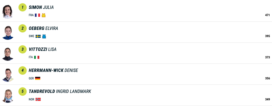 В генералното класиране за Световната купа начело с 471 точки остава Симон, втора с 395 пункта е Елвира Йоберг, а трета с 373 е Лиза Витоци. Италианката завърши едва 23-та днес, след като направи цели пет наказателни обиколки и така се смъкна зад Йоберг в битката за големия кристален глобус.