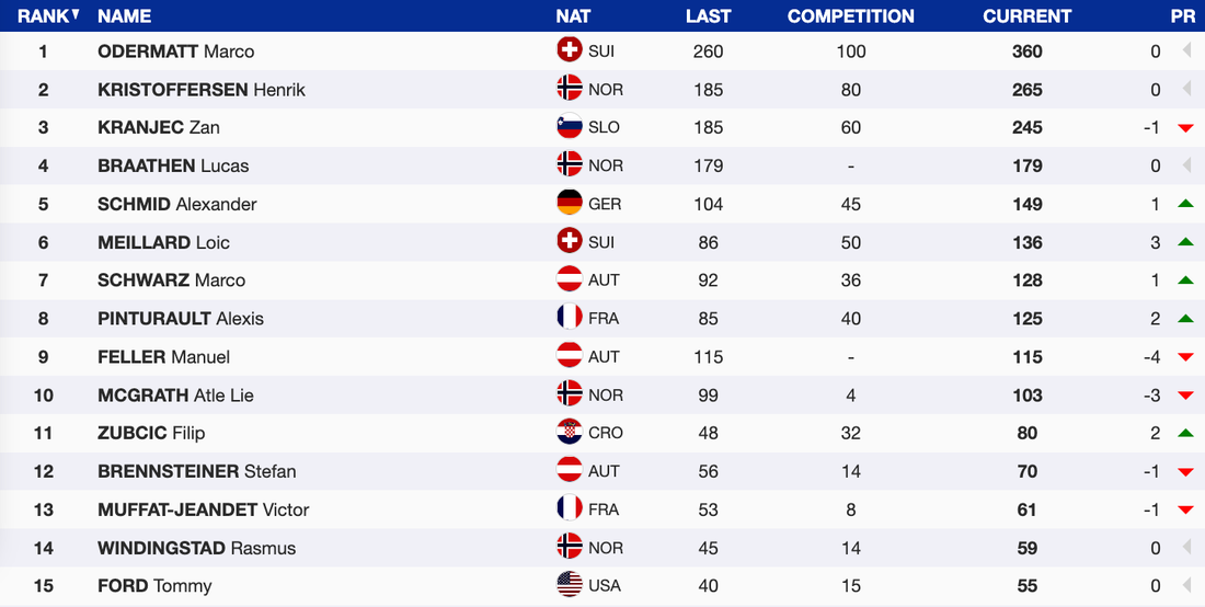 В битката за малкия кристален глобус с три победи и едно трето място лидер отново е Одермат, който има общо актив от 360 точки. Втори с 265 е Кристоферсен, а трети с 245 е Кранец.