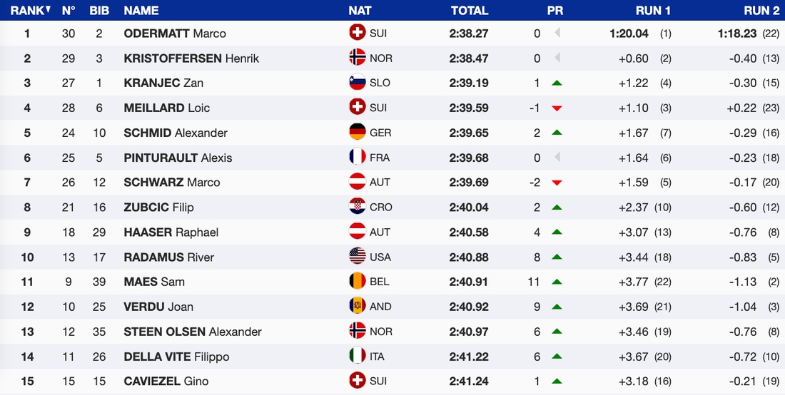 Одермат бе най-бърз в първия манш по-рано днес, след който той имаше аванс от цели 0.60 секунди спрямо норвежеца Хенрик Кристоферсен. Във вторто спускане Принца на викингите бе по-бърз от Одермат, но със само 0.40 и така на финала разликата между двамата бе 0.20 в полза на швейцареца.