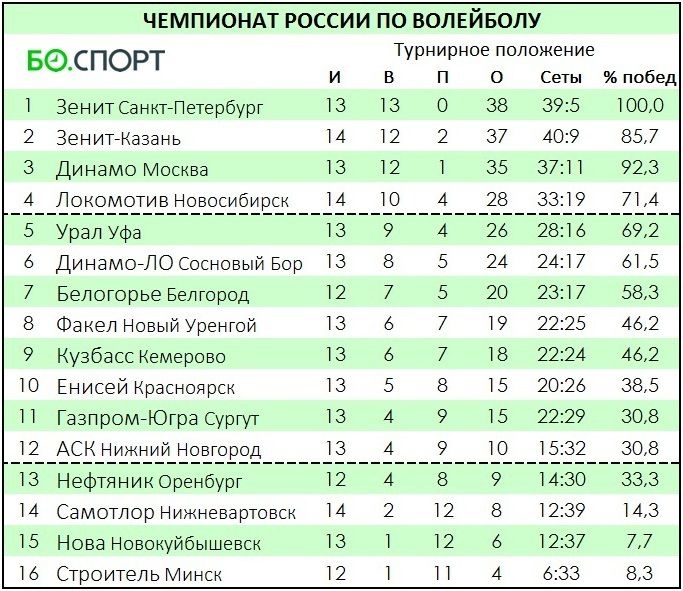 Лидер е Зенит (Санкт Петербург) с 38 точки (13 победи).