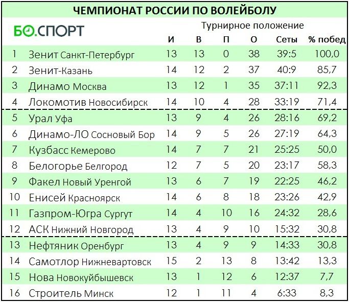 Така с актив от 18 точки (6 победи, 8 загуби) Енисей е на 10-о място, Нефтяник допусна 9-а зогуба и с актив от 9 точки (4 победи, 9 загуби) е 13-и.
