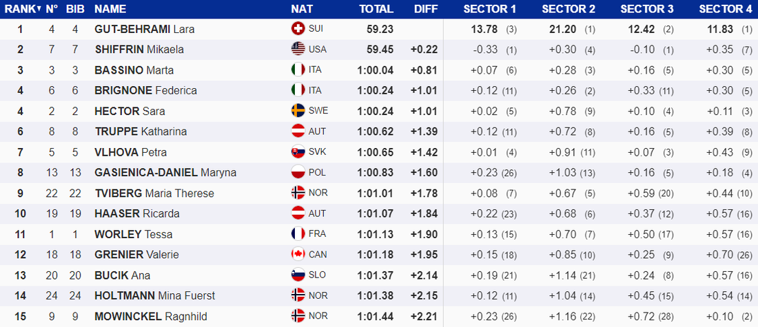 В челото световната шампионка в дисциплината от Кортина д‘Ампецо 2021 Гут-Бехрами си осигури аванс от 0.22 секунд пред победителката от вчерашния гигантски слалом в Земеринг Микаела Шифрин (САЩ). Третото място преди второто спускане по-късно днес се заема от водачката в класирането в гигантския слалом Марта Басино (Италия), чийто пасив от първото място обаче е цели 0.81 секунди.