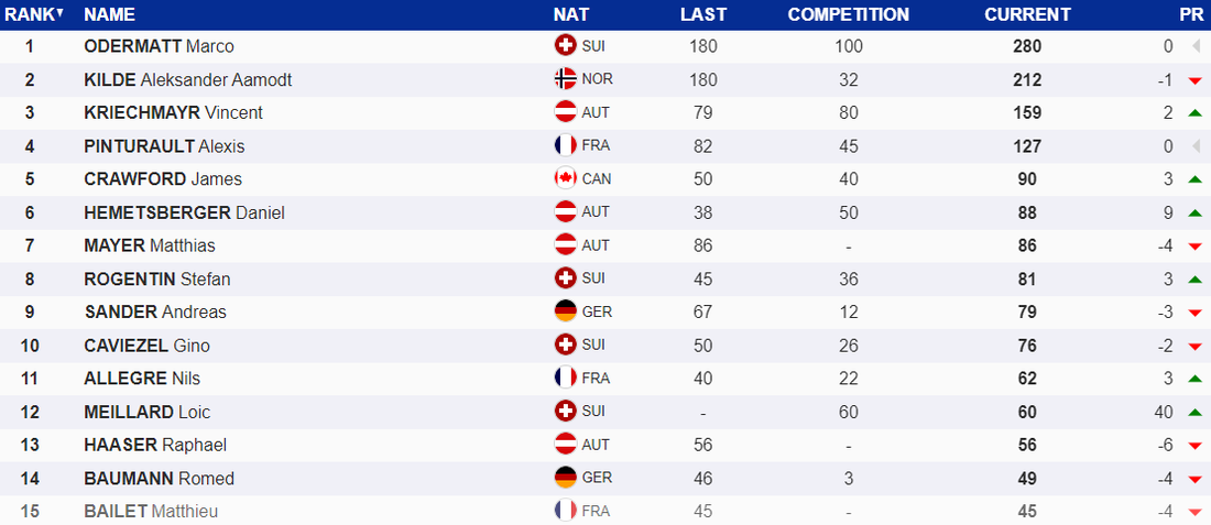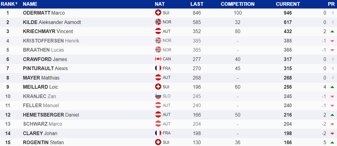 По този начин Килде загуби нови 68 точки от Одермат в битката за големия кристален глобус. В нея швейцарецът остава начело с актив от 946 пункта и аванс от цели 329 спрямо Килде. Трети с изоставане от 514 е Крихмайр, който днес се изкачи с две места напред, изпреварвайки двамата норвежци Хенрик Кристоферсен и Лукас Бротен, които обаче не стартират в скоростните дисциплини.