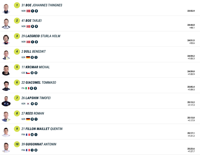 На крачка от подиума остана световният шампион в дисциплината от Хохфилцен 2017 Бенедикт Дол (Германия), който завърши на 1:03.3 от Бьо, след като и той завъртя една наказателна обиколка. Топ 5 допълни чехът Михал Кръчмар, който бе с 0.6 по-бавен от Дол въпреки безгрешната си стрелба.