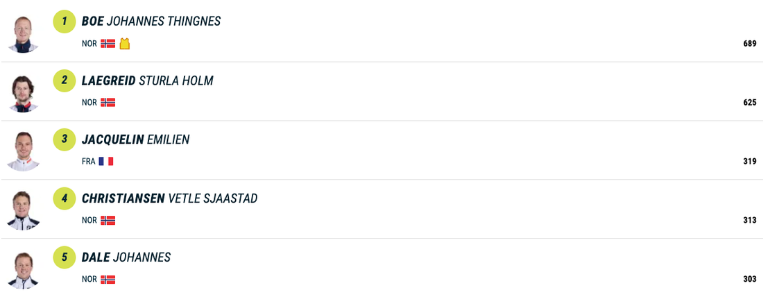 Със своите шест победи в девет индивидуални старта от началото на сезона Йоханес Бьо води в генералното класиране за Световната купа с общо 689 точки и преднина от 64 пред Легрейд. Трети с пасив от цели 370 пункта е французинът Емилиян Жаклен, който днес завърши чак 64-ти след общо пет наказателни обиколки.