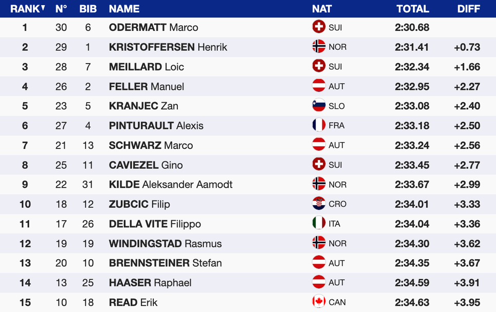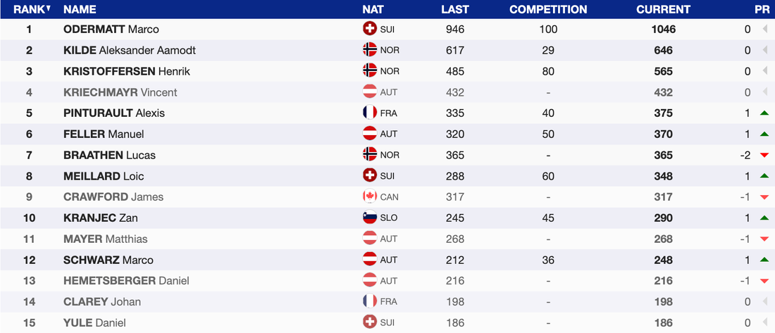 Със своята шеста победа за сезона Одермат премина границата от 1000 точки, като в генералното класиране той е начело с общ актив от 1046 пункта. Втори с пасив от точно 400 точки е норвежецът Александър Омод Килде, който завърши девети днес. Челната тройка допълва Кристоферсен, чието изоставане от лидера е 481 пункта.