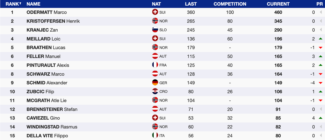 В битката за малкия кристален глобус в дисциплината с четири победи и едно трето място Одермат е начело с 460 точки и аванс от 115 пред Кристоферсен. Трети в класирането в дисциплината е Кранец, който изостава със 170 пункта от водача в подреждането.