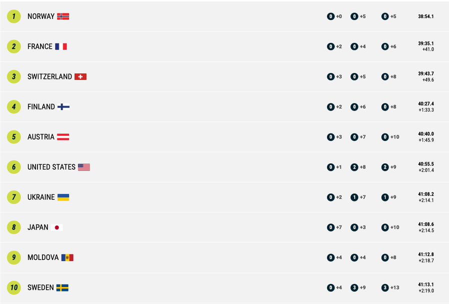 Тройката допълниха представителите на Швейцария Никлас Хертвег и Ейми Басерга, които пресякоха финалната линия с пасив от 49.6 секунди. Двамата използваха осем допълнително патрона, но успяха да се опазят от влизането в наказателната обиколка. Топ 5 допълниха отборите на Финландия (Туомас Харюла, Суви Минкинен) и Австрия (Симон Едер, Лиза Тереза Хаузер), които завършиха със съответно 0+8 и 0+10.