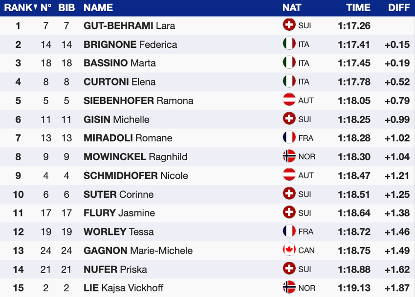Гут-Бехрами финишира за 1:17.26 минути, с което завърши на 0.15 секунди пред победителката от вчерашния първи супергигантски слалом в Санкт Антон Федерика Бриньоне (Италия). Швейцарката направи своя голям удар в третия сектор на пистата, в който е и най-стръмната част от трасето.