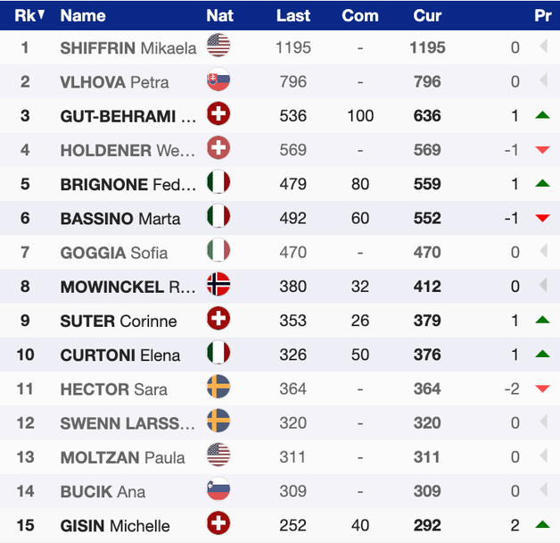 В битката за големия кристален глобус убедително начело продължава да е Микаела Шифрин (САЩ), която с 1195 точки води с 399 пункта на Петра Влъхова (Словакия), като и двете не участваха в състезанията в Санкт Антон. Днешната победителка Гут-Бехрами се върна в челната тройка в общото подреждане, в което тя изостава с 559 точки от Шифрин.