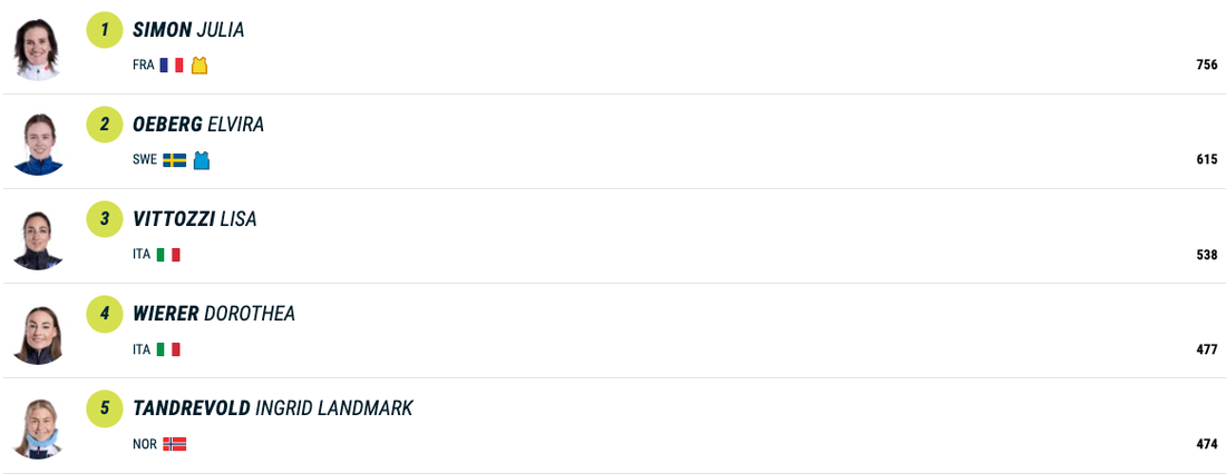 В класирането в масовия старт след два от четирите старта през сезона начело е Симон, която със 165 точки води с 39 на победителката от състезанието в Анеси льо Гран Борнан (Франция) на 18 декември Лиза Тереза Хаузер (Австрия), която днес завърши седма след две наказателни обиколки и едно падане, което ѝ коства над 20 секунди. Трета в подреждането в дисциплината е Шевалие-Буше, която с двете си трети места в двата проведени масови старта има събрани 120 точки.