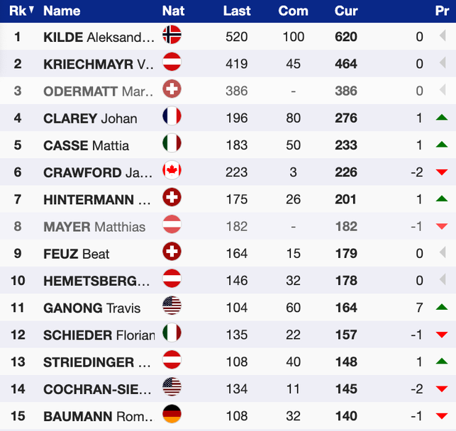В битката за малкия кристален глобус в спускането лидер с 620 точки е Килде, втори с 464 е Крихмайр, а трети с 386 е Одермат, който не стартира днес.