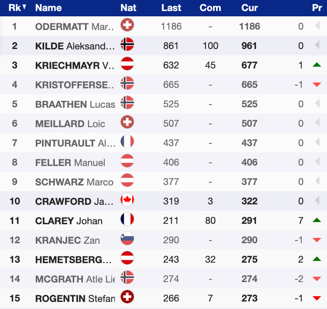 С победата си днес Килде стопи своето изоставане спрямо Марко Одермат на върха в генералното класиране за Световната купа, в което действащият носител на големия кристален глобус продължава да води с 1186 точки и аванс от 225 спрямо Килде. Трети с пасив от 509 е победителят от вчера Крихмайр.