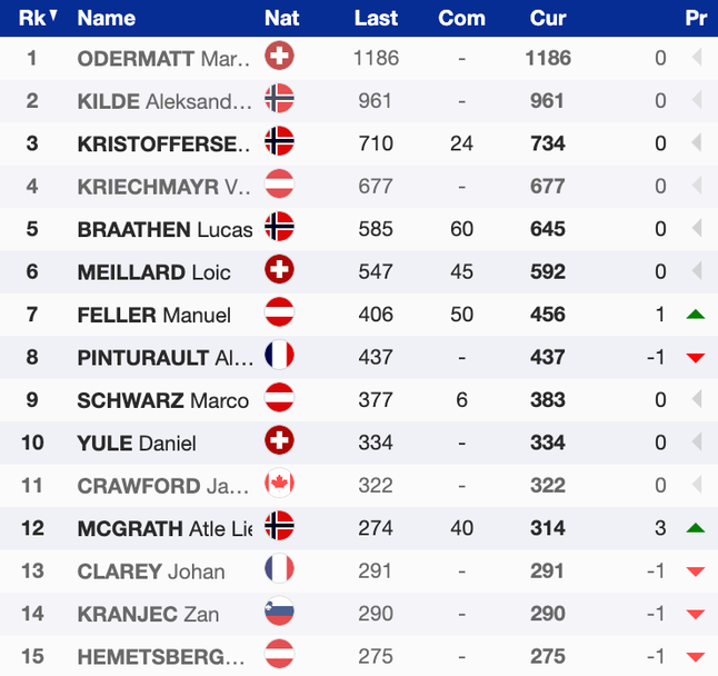 В генералното класиране за Световната купа начело остава Марко Одермат (Швейцария), който с 1186 точки води с 225 на норвежецът Александър Омод Килде. Трети с пасив от 454 пункта е 11-ят от днес Кристоферсен.