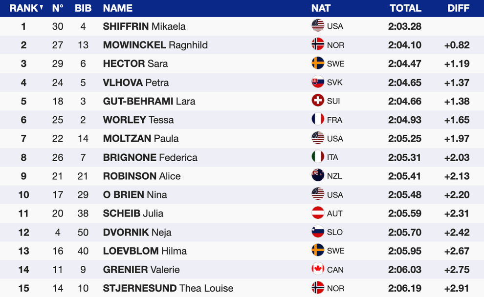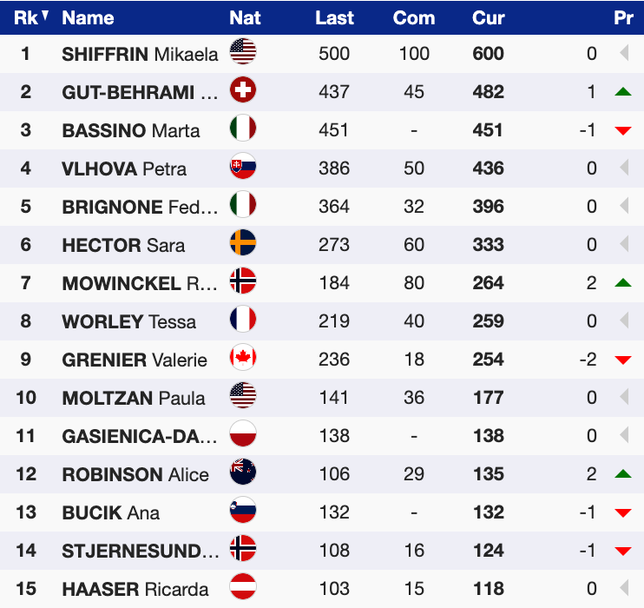 Със своята десета победа от началото на сезона Шифрин продължи своя поход към петия си голям кристален глобус. В генералното класиране за Световната купа американката води с актив от 1517 точки и аванс от цели 601 спрямо Гут-Бехрами. Трета с изоставане от 611 пункта е Влъхова.