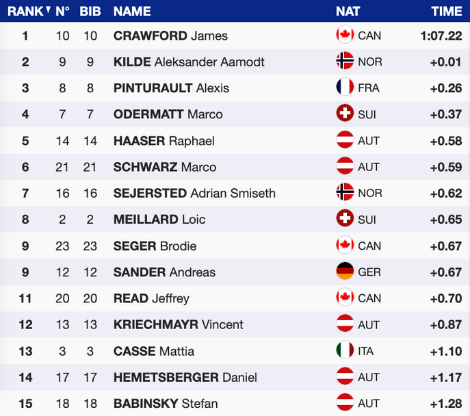 Подобно на Басино вчера канадецът направи своя удар в долната част на трасето, като и той бе над всички в последния сектор на трасето. В него той бе с 0.19 секунди по-бърз от Александър Омод Килде (Норвегия), който до последната контрола водеше с 0.18 на канадеца, след като бе най-бърз в първия и втория сектор. В тях Крауфорд даде съответно 10-то и 4-то време, след което обаче бе по-бърз от Килде в долните два, за да спечели златото с аванс от само 0.01 секунда.