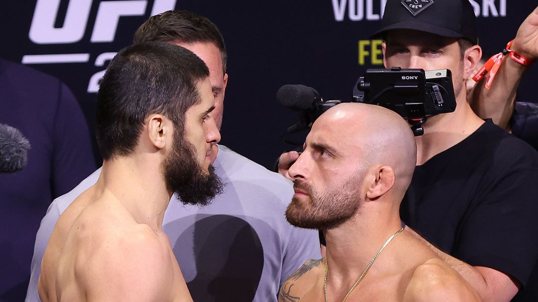 Двамата си влязоха в лимита за категорията. Ислам Махачев тежеше 70.30 килограма, а Александър Волкановски закова 70.08 килограма.