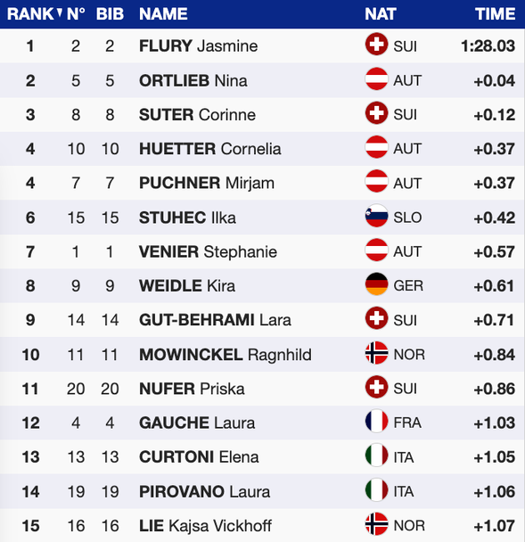 В подножието на подиума завършиха двете австрийки Корнелия Хютер и Мириям Пухнер, които споделиха четвъртото място, с изоставане от 0.37 секунди. Шестото място бе за двукратната световна шампионка в дисциплината от Санкт Мориц 2017 и Оре 2019 Илка Щухец (Словения), която изостана с 0.42 от Флури.