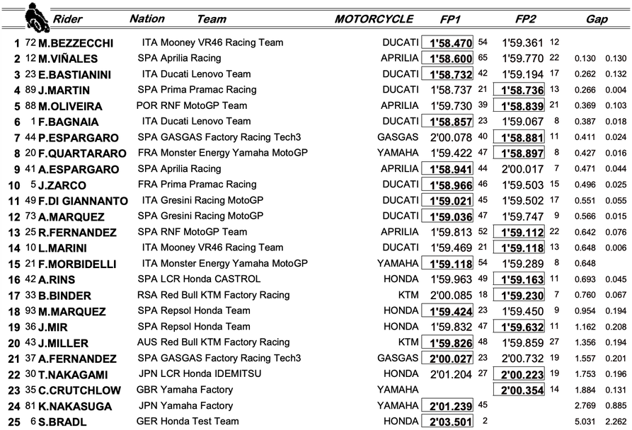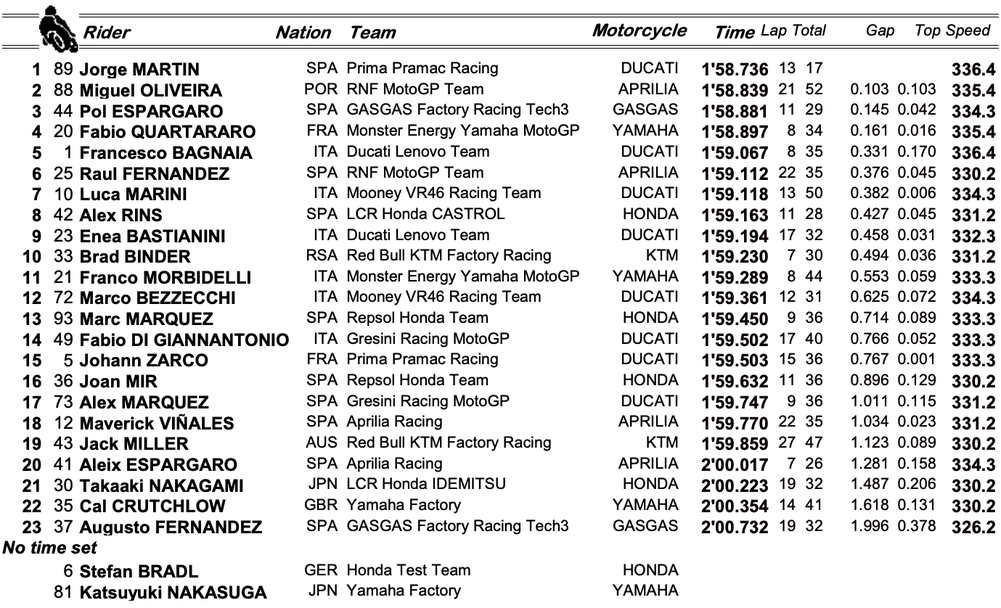 Показателно за това е фактът, че в рамките на осемте часа, в които пистата беше отворена Мартин направи само 17 обиколки, записвайки най-бърз тур от 1:58.736. По този начин испанецът завърши на 0.103 секунди пред пилота на РНФ Априлия Мигел Оливейра, който бе най-активен от всички и завърши деня с 52 обиколки. Единственият друг пилот, който достигна до границата от 50 тура бе Лука Марини (ВР46 Дукати), който завърши с точно 50 обиколки.