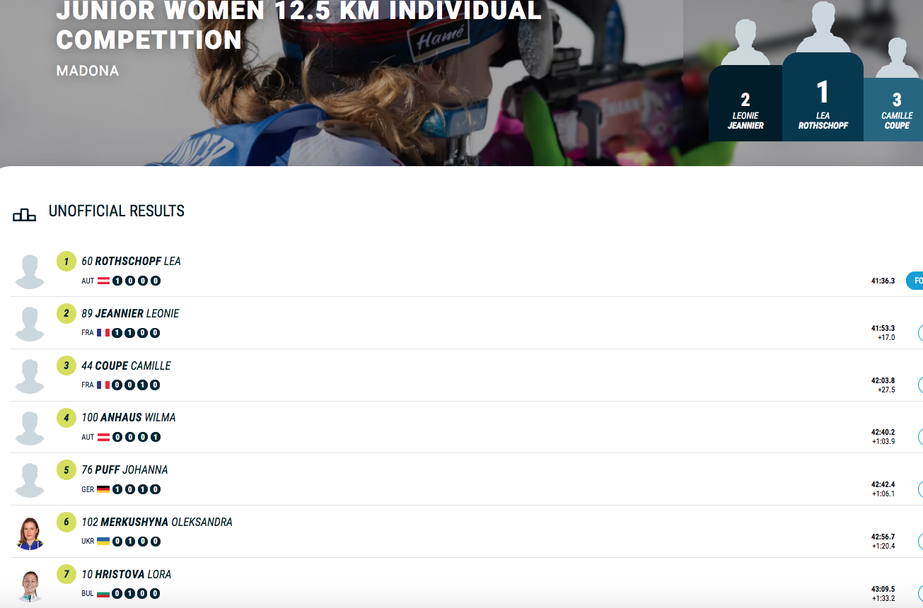 Българката Лора Христова завърши на седмо място в индивидуалната дисциплина на 12,5 километра на Европейското първенство по биатлон за младежи и девойки в Мадона (Латвия).