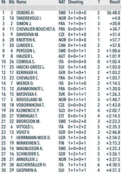 В подножието на медалите завърши втората представителка на Франция Анайс Шевалие-Буше, която подобно на Симон допусна грешка, нейната единствена, в последната стрелба и загуби шанс да се бори за челните позиции. Топ 5 допълни чехкинята Маркета Давидова, която направи общо три наказателни обиколки днес.