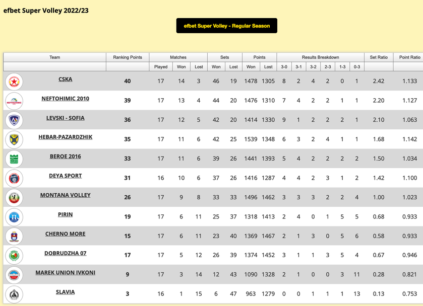 Хебър пък остава 4-и с 35 точки след 11 победи и 6 загуби, колкото имат и 5-ият Дея спорт (Бургас) и 6-ият Берое 2016 (Стара Загора), но съответно с 34 и 33 точки.