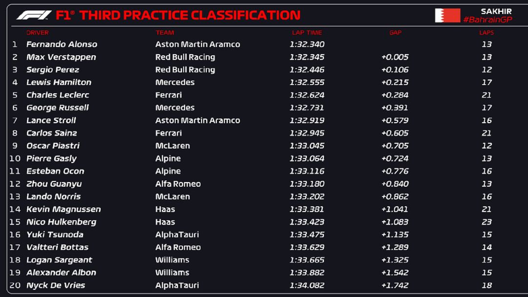 Тройката в края на последния час за подготовка в Бахрейн допълни съотборникът на Верстапен в Ред Бул Серхио Перес, който завърши на 0.106 зад Алонсо. Четвърти и пети се класираха съответно Люис Хамилтън и Шарл Леклер, които бяха с респективно 0.215 и 0.284 по-бавни от първия.