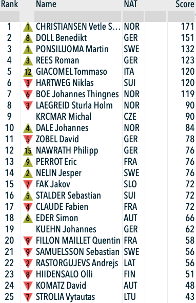 Днешният старт бе трети и последен за сезона в дисциплината, където малкият кристален глобус със 171 точки и аванс от 20 спечели Кристиансен. Втори след днешната си победа остана Дол, а топ 3 допълни победителят от индивидуалната надпревара в Контиолахти (Финландия) на старта на сезона Мартин Понсилуома (Швеция), който изостана с 39 точки от Кристиансен, след като завърши осми днес.