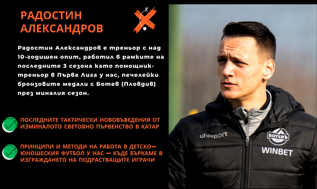 Радостин Александров е треньор с над 10-годишен опит, работил в рамките на последните 3 сезона като помощник-треньор в Първа Лига у нас, печелейки бронзовите медали с Ботев (Пловдив) през миналия сезон. Той ще представи последните тактически нововъведения от изминалото Световно в Катар, както и някои важни принципи и методи на работа в детско-юношеския футбол у нас.