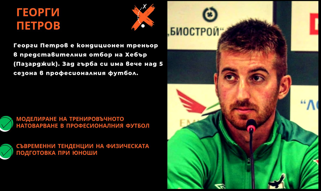 Георги Петров е кондиционен треньор в представителния отбор на Хебър (Пазарджик). Зад гърба си има вече над 5 сезона в професионалния футбол. Георги ще представи теми за моделиране на тренировъчното натоварване при мъжете професионалисти, както и съвременни тенденции при работа с подрастващи.