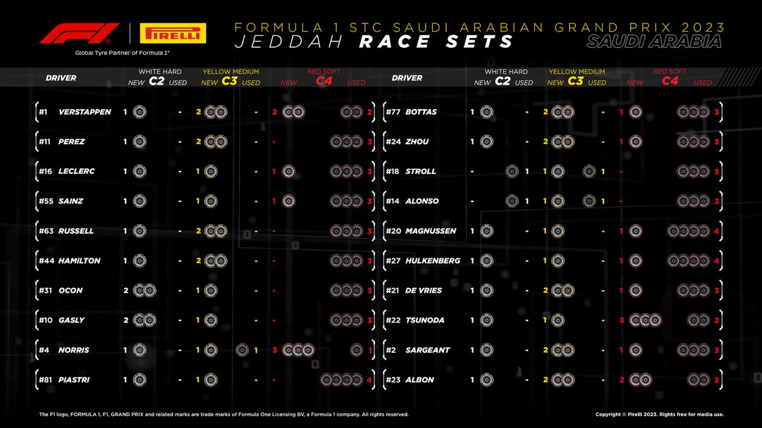 За разлика от надпреварата за Гран При на Бахрейн, с която се откри сезон 2023 във Формула 1 преди две седмици, днес в Гран При на Саудитска Арабия не се очаква голяма деградация на гумите. Именно поради тази причина прогнозите са повечето пилоти да направят по само едно влизането в бокса, за задължителната смяна на гуми. Но кой пилот с какви гуми разполага преди старта в Джеда?