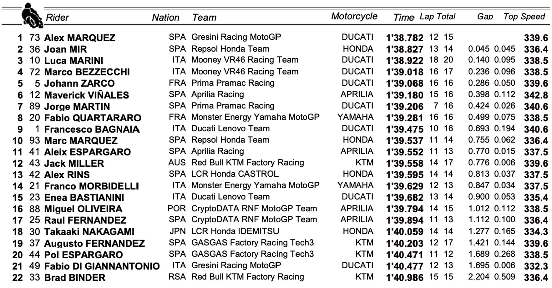 Испанецът успя да завърти обиколка за 1:38.782 в хода на първите 45 минути за подготовка на пистата „Алгарве“. Така той победи с 0.045 секунди световния шампион за 2020 година Жоан Мир, който този уикенд прави своя дебют за екипа на Хонда. Тройката в края на първата тренировка в Португалия допълни Лука Марини от екипа на ВР46 Дукати, който бе с 0.140 по-бавен от Маркес.
