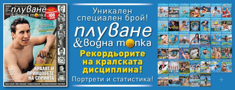 Специалното издание на списание „Плуване & Водна топка“ е вече в продажба! Ще го има на държавното отборно първенство на столичния басейн „Спартак“, което ще се състои от петък до неделя (7-9 април). Брой № 41 е исторически, защото е посветен на царете на кроуловия спринт в България. Това са 15-те рекордьори в кралската дисциплина – 100 метра свободен стил на 50-метров басейн.