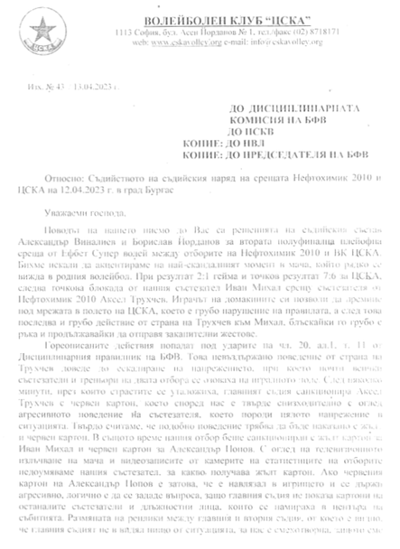 От Национална волейболна лига потвърдиха, че има такова писмо и то е входирано. Очаква се решение на Дисциплинарната комисия.
