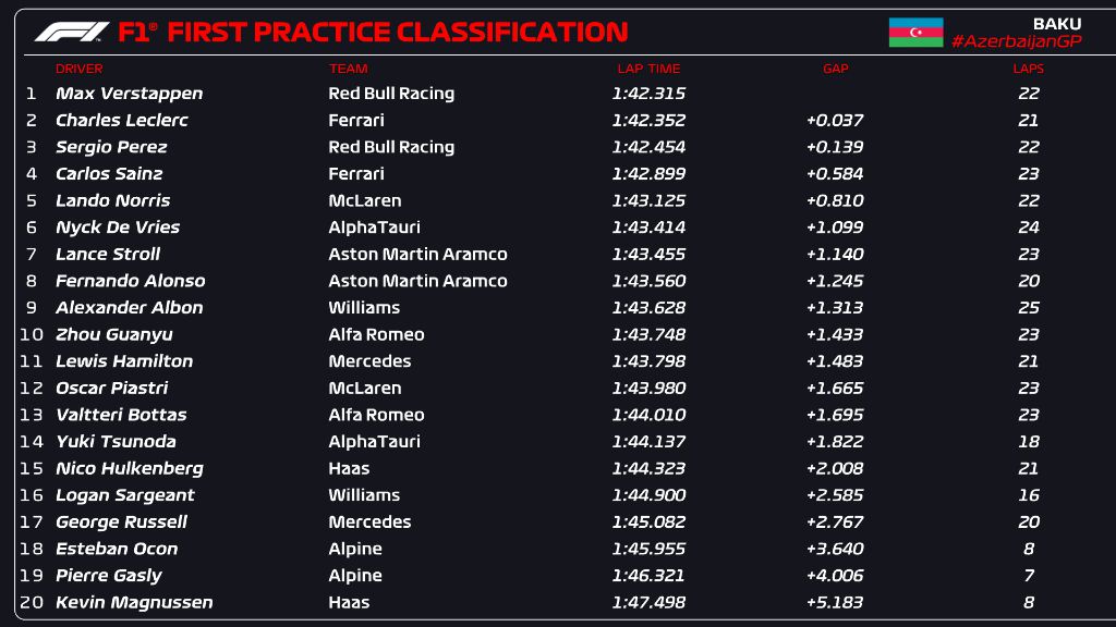 Нидерландецът записа 1:42.315 по време на квалификационните симулации с меките гуми в края на единствения час за подготовка край бреговете на Каспийско море. Така той победи с 0.037 секунди пилота на Ферари Шарл Леклер, който по-късно днес ще се опита да спечели третата си поредна квалификация по улиците на Баку. Тройката в единствената тренировка в Азербайджан допълни Серхио Перес, който изостана с 0.139 секунди от съотборника си Верстапен.