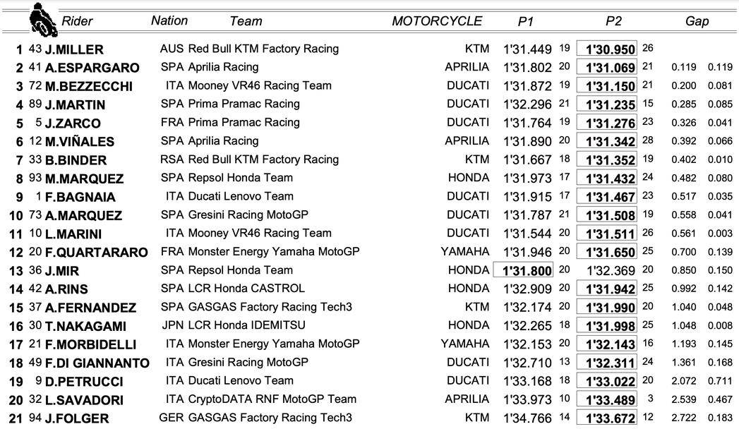 Австралиецът стигна до 1:30.950 по време на квалификационните симулации в края на тренировката и стана първият и единствен пилот, който слиза под 1:31 за обиколка днес. Втората позиция, на 0.119 секунди зад пилота на КТМ, зае Алейш Еспаргаро (Априлия), а тройката в края на петъчния ден във Франция допълни доскорошният лидер в генералното класиране в MotoGP Марко Бедзеки (VR46 Дукати). Италианецът изостана с 0.200 секунди от Милър.