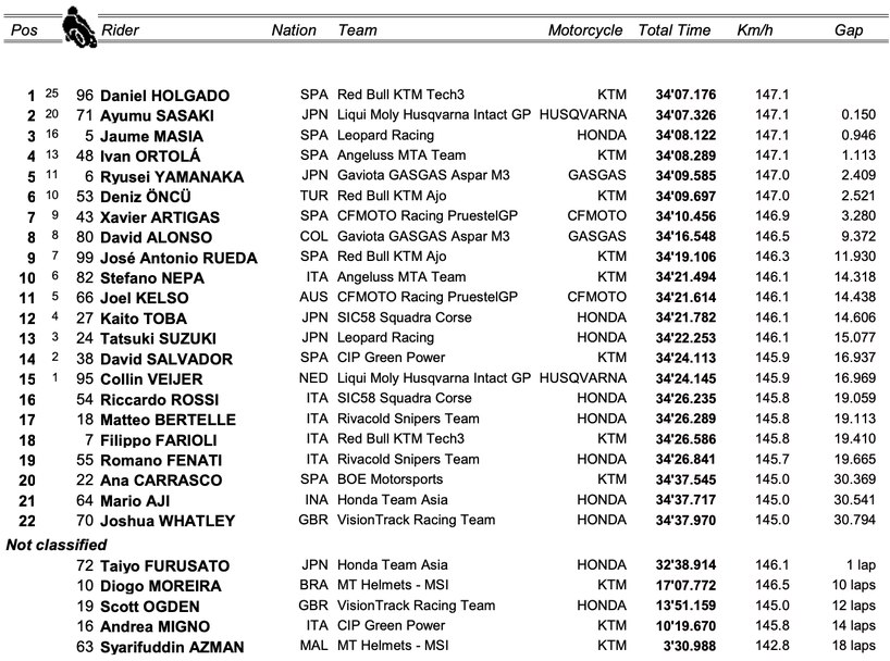 Победителят от последните два старта в най-малкия клас днес не успя да се пребори за третия си пореден успех, но с 13-те точки, които си заслужи за четвъртото място той се изкачи на втората позиция в генералното класиране. В него лидер с актив от 84 пункта продължава да бъде днешният победител Олгадо, който води с 21 точки на Ортола. Тройката се допълва от Масия, който има равен актив с Ортола, но двете победи на Ортола му дават предимство.